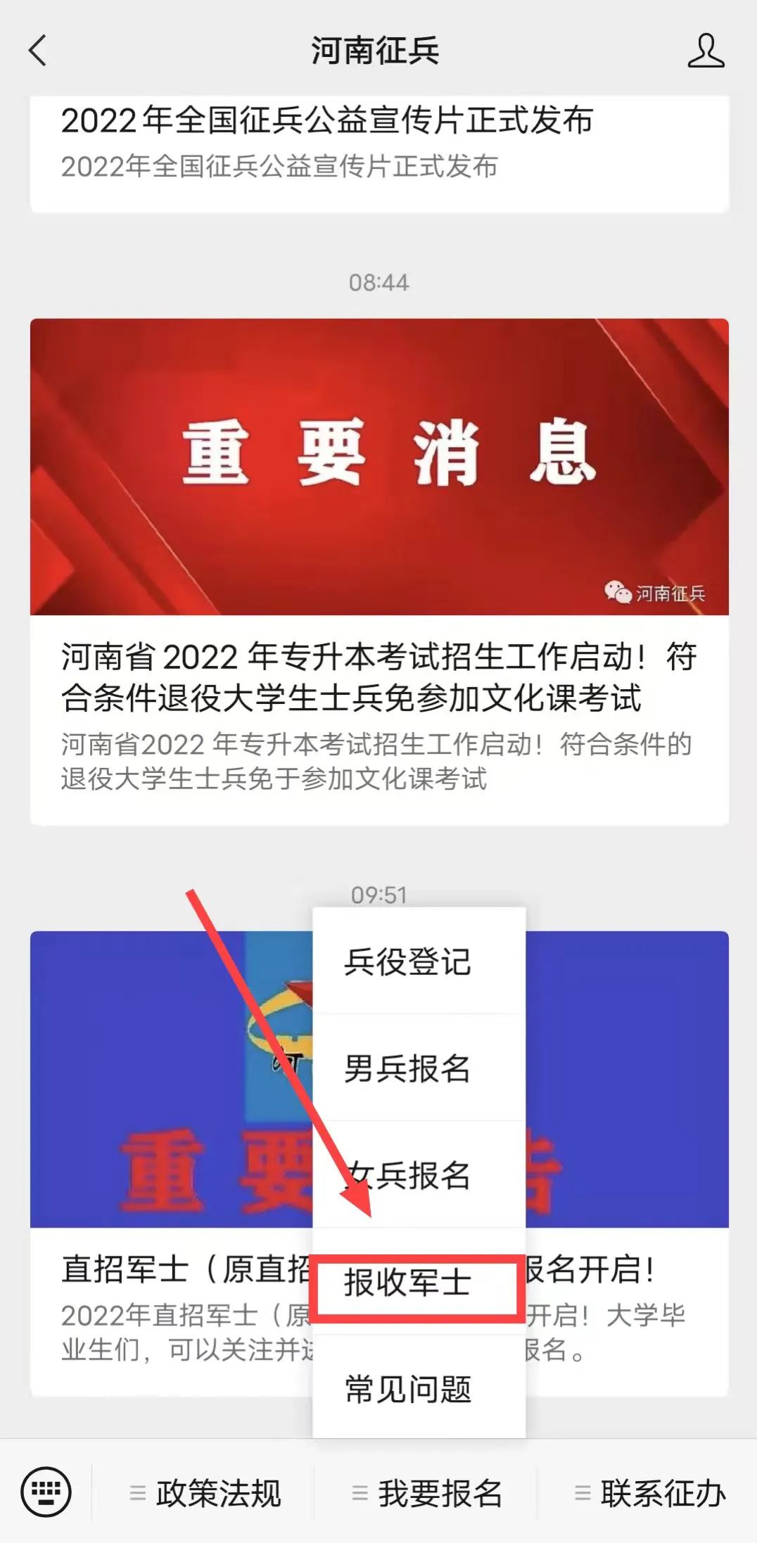 方式二:也可以关注“河南征兵”,点击下方正中“我要报名”。