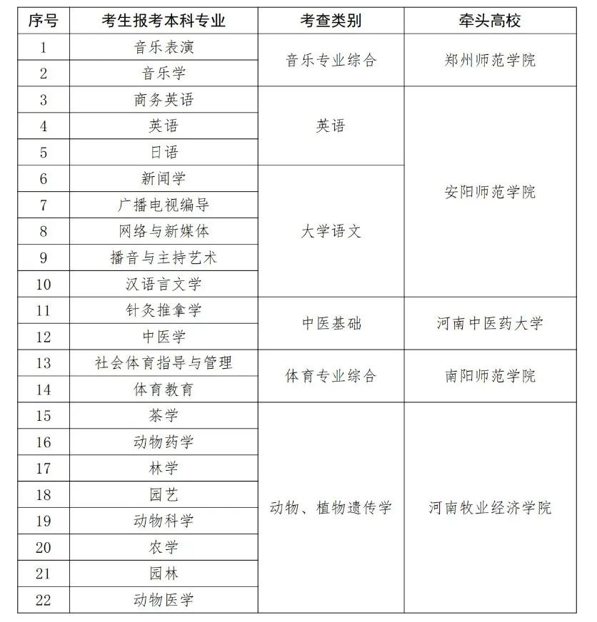 根据《河南省教育厅 河南省退役军人事务厅关于做好2022年普通高等学校专升本考试招生工作的通知》(教学〔2022〕85号)精神,为扎实做好我省退役大学生士兵专升本招生工作,经研究,决定委托部分高校承担相关专业大类下高校联考牵头任务,现将2022年河南省退役大学生士兵专升本综合考查牵头高校名单予以公布(见附件)。