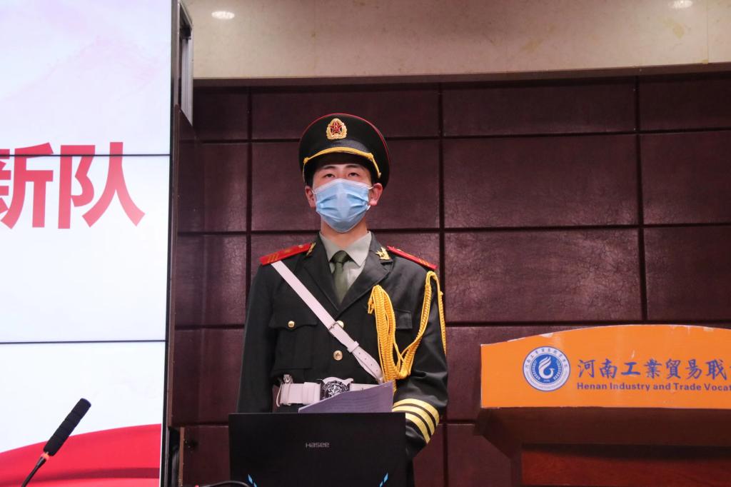 21级国旗护卫队新生代表邱叶红进行发言,他说“虽然我们距离国旗台很近只需要走几步路,但是在那一条短短的几十米的路程上每一厘米都有我们的脚印、有我们的汗水。我们比其他学生辛苦的多,甚至我们的训练科目会让我们受伤,流血!但是我们还是义不容辞。”