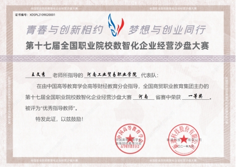 9月25日,第十七届全国职业院校数智化企业经营河南省赛在线上举行。本次大赛是由中国高等教育学会高等财经教育分会指导,全国商贸职业教育集团主办,本次大赛分为校内选拔赛、省赛、全国总决赛三个阶段。我院由雷启英、唐书萍、王文秀老师指导、20级15名同学组成的三支队伍,在疫情封闭期间克服困难,在家自觉训练,认真准备,最终在激烈的竞争中脱颖而出,三组分别取得河南省赛高职组一等奖、二等奖、三等奖的优异成绩!