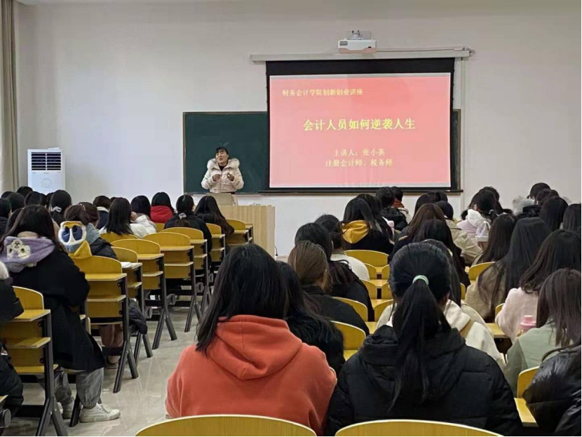 2020年12月21日,财务会计学院邀请中天银会计师事务所所长、注册会计师、税务师张小英老师为2020级学生开展了题为“会计人如何逆袭人生”的讲座,冬天的寒冷被同学们的热情点燃,同学们带着对会计专业的疑惑和憧憬来到附201教室,聆听了这场创业就业讲座。
