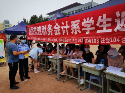 在财务会计系学生返校登记点,学生们有序排队,依次提交承诺书与健康登记卡,填写返校登记表,领取爱心包。老师们为学生讲解入校注意事项,办理入校手续,分配宿舍。返校学生在老师们的指导和帮助下有序进入宿舍,打扫宿舍卫生。