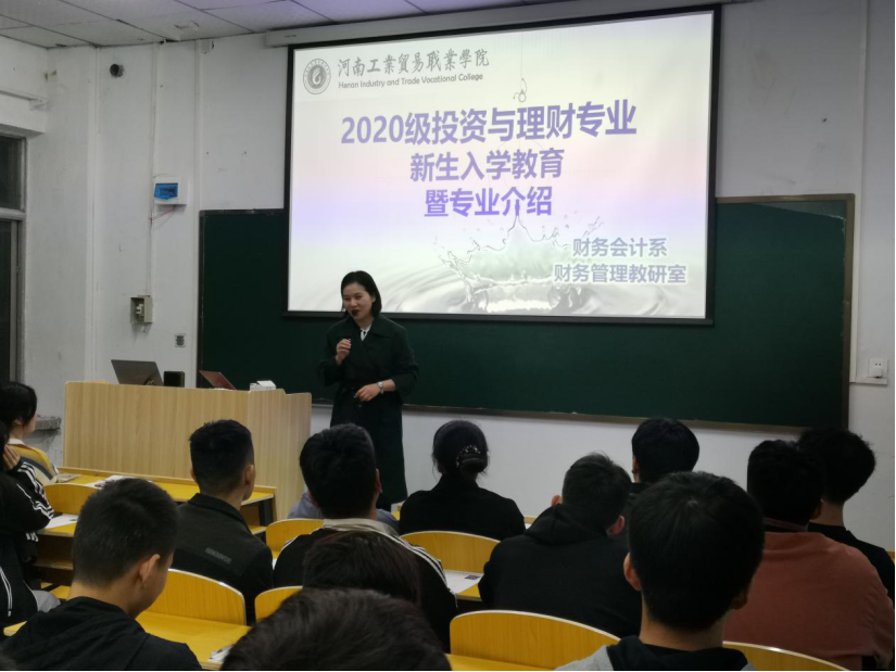 为加强2020级新生对专业的认知,使学生了解就业前景,树立成长目标,10月19日晚上,财务会计系投资与理财专业在北校区8104教室举行了新生入学教育及专业介绍活动。财务会计系主任谢桦、财务管理教研室主任李锐、实训室主任刘阿千、教学办公室主任暨2020级投资101班辅导员梁一村及2020级投资与理财专业全体新生参加了此次活动。此次活动由梁一村主持,按照政治思想教育、疫情防控第一课、专业教育、安全教育四个专题开展,内容丰富,题材多样。