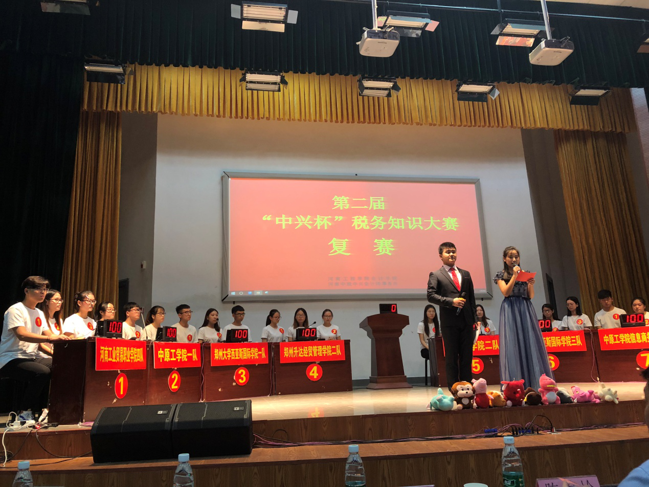 2018年9月28日下午,由河南工程学院会计学院和河南中税中兴税务师事务所联合举办,我院财会系等郑州市南大学城各高校协办的第二届“中兴杯”税务知识大赛复赛在河南工程学院南校区8号楼创业大讲堂举行。我院财务会计系各代表队发挥出色,在激烈竞争中沉着冷静,不负众望地夺得了一张决赛的宝贵入场券。