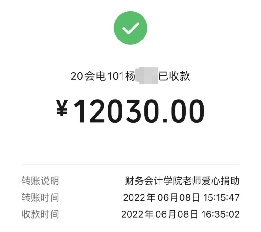 财务会计学院党总支了解该同学的情况后,立即发起了《爱心捐款倡议书》,在图书馆B8004组织了现场募捐,同时发起线上募捐活动。活动得到了全体专兼职教师的积极响应,老师们纷纷伸出援助之手,短短四个小时的时间,共募集到12030元,并通过辅导员转账给该同学。