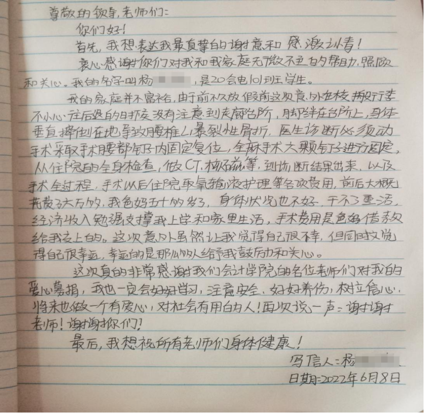 杨小薇(化名)同学收到募捐款后深受感动,虽然卧病在床但立即手写一封感谢信,向全体伸出援手无私捐助的老师们表达感谢。她说:“老师们的温暖关爱给了我无限的动力,让我们一家有信心挺过这次难关。等我康复之后一定会好好学习,去回报所有帮助过我的老师们!”