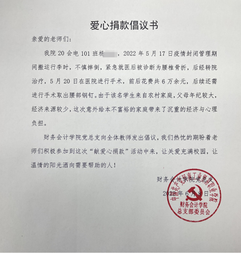 为贯彻落实《中共河南工业贸易职业学院委员会关于印发<开展“能力作风建设年”活动实施方案>的通知》(豫工贸党〔2021〕160号)精神,切实提高服务群众的能力作风,引导党员干部带头践行以学生为中心的发展思想,为学生解决“急难愁盼”的问题,2022年6月8日上午,财务会计学院党总支组织了爱心捐助活动。
