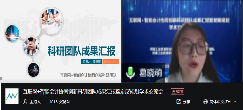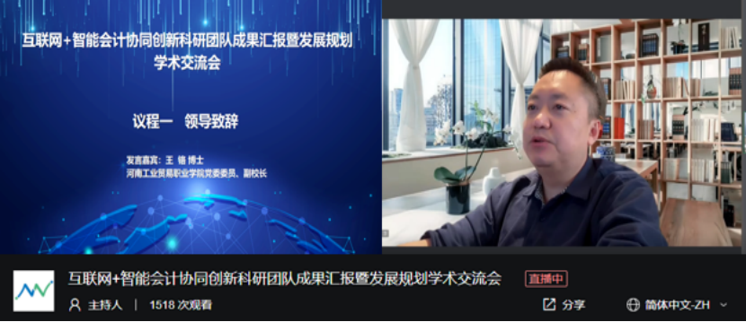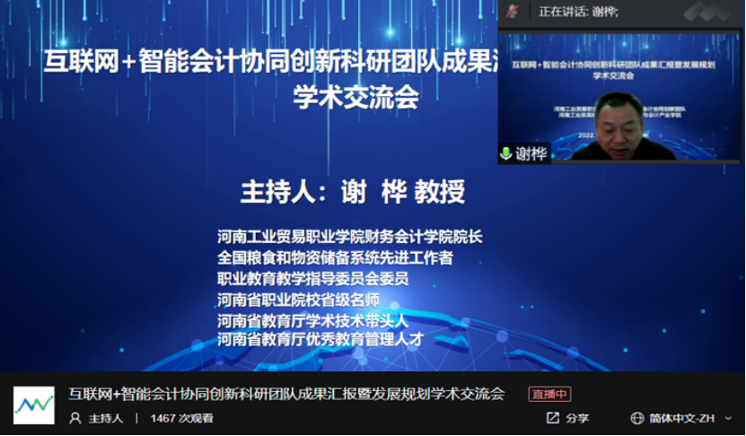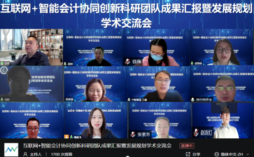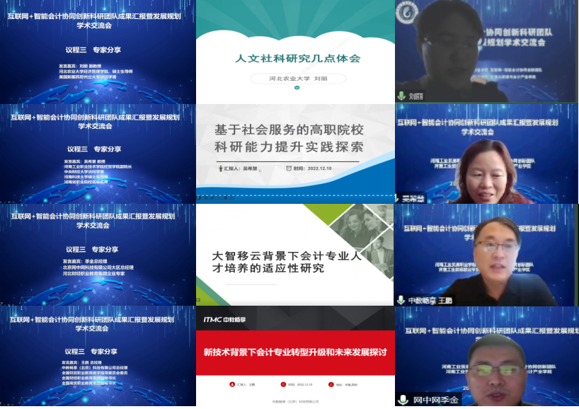 为搭建科研平台,激发创新活力,推进科研反哺教学,助力学校科研事业高质量发展,12月10日上午,财务会计院举办了“互联网+智能会计协同创新科研团队成果汇报暨发展规划”线上学术交流会。河北农业大学经济管理学院副教授刘丽,河南工业职业技术学院经贸学院副院长、教授吴希慧,中教畅享(北京)科技有限公司总经理、全国财政职业教育教学指导委员会委员王鹏,北京网中网科技有限公司大区总经理、河北财经职业教育集团企业专家季金,省内外兄弟院校教师、行业专家学者及本校师生参加了会议。河南工业贸易职业学院党委委员、副校长王铬出席会议。会议由财务会计学院院长谢桦教授主持。