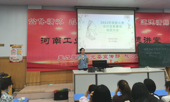 为贯彻《中华人民共和国职业教育法》、《国家职业教育改革实施方案》等文件精神,落实职业教育高质量发展的重要行动措施,财务会计学院秉承“坚持以学生发展为中心,以就业为导向”的理念,以职业技能大赛工作为抓手,积极推进“岗课赛证”综合育人模式。2023年6月11日晚,在优胜校区4201教室举办2023年河南高等职业教育技能大赛动员大会,梁一村老师、刘阿千老师和齐晓培老师分别就会计实务赛项、智慧金融赛项和业财税融合大数据应用赛项做了相应介绍。学院2022级各专业优秀在校生参加了本次动员大会。