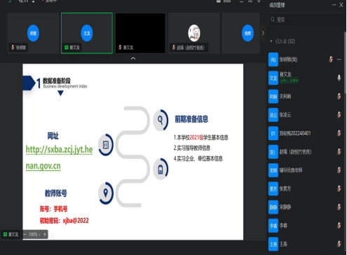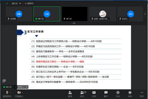 夏文龙就实习备案政策和平台的具体操作步骤进行详细的讲解,包括:政策变化、实习备案前期准备工作、上传实习方案的要求、审核和落实实习单位的要求、办理实习责任险的要求、线上+线下一体化监管的要求、落实考核和评价制度的要求等方面进行了深入交流和分享。通过梳理以往实习备案过程中存在的痛点问题,提醒各位实习指导老师从违规实习案例中汲取教训,引以为戒,警钟长鸣。