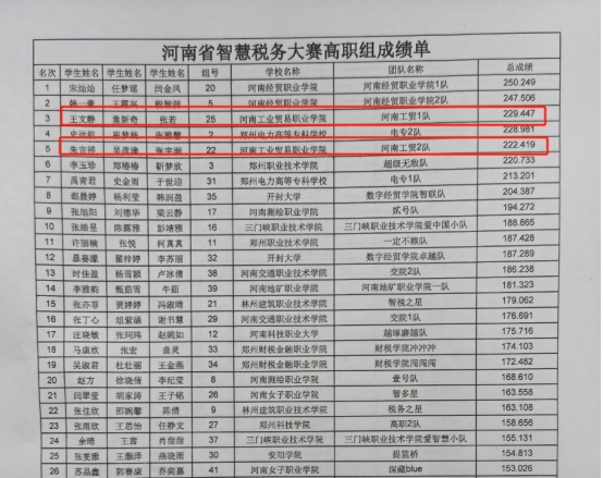 2024年11月3日,由河南省高等教育学会主办的“衡信杯”大学生智慧税务大赛河南省赛(高职组)在河南财政金融学院拉开帷幕。高职共计24所学校,42支队伍参赛。我院张明敏、王晓辉等老师指导的王文静、童新奇、张若团队,及朱吉祥、吴彦潼、张宇润团队分别以第三名和第五名的成绩,取得省赛一等奖佳绩,两支队伍顺利进入国赛。