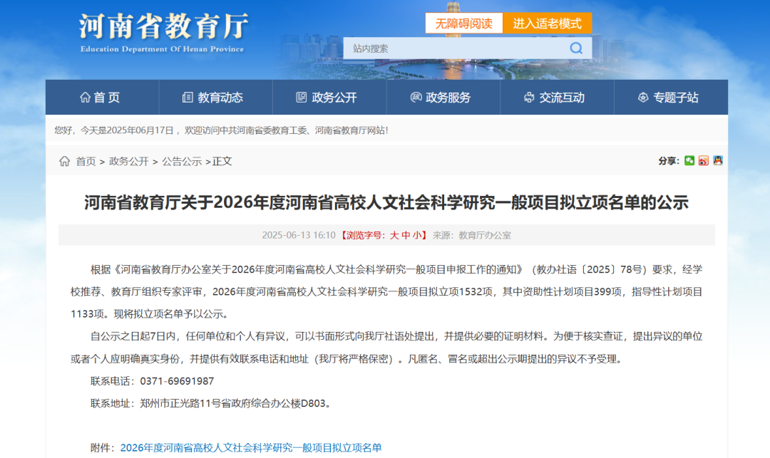 近日,根据河南省教育厅公布的《河南省教育厅办公室关于2026年度河南省高校人文社会科学研究一般项目拟立项名单公示》,大数据会计学院成功获批两项河南省2026年度高校人文社会科学研究一般项目立项。