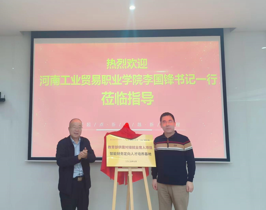 座谈会上,李国锋介绍了学校办学定位与大数据会计学院的专业优势,希望与企业在实习就业基地建设、产教融合项目推进及人才培养创新等方面深化合作,拓宽毕业生就业渠道,实现校企共赢。其间,双方依托教育部供需对接就业育人项目,共同为“智能财务定向人才培养基地”揭牌。