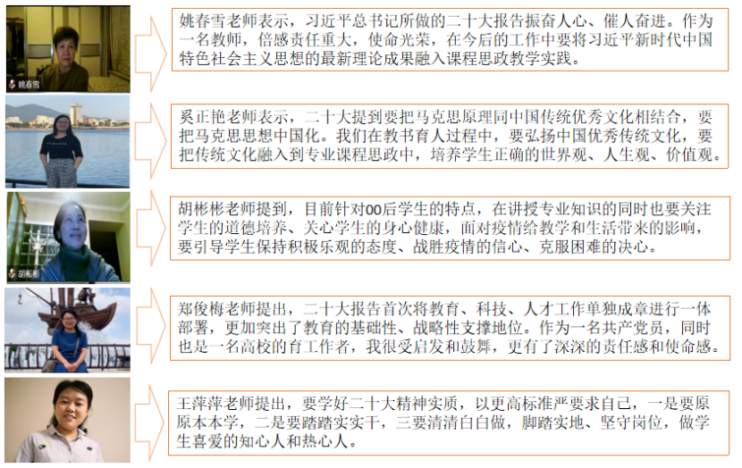 第三个环节是讨论与交流。参会教师们积极发言,纷纷讲述自己学习二十大精神的感悟和对课程思政建设的思考。