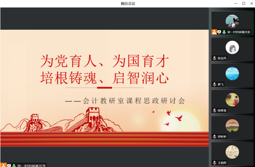 11月3日晚,财务会计学院围绕党的二十大精神畅谈学习体会,开展课程思政研讨活动,统一思想认识,推动党的二十大精神第一时间带着热度、高度、温度进课堂、进头脑。活动由会计教研室主任梁一村主持,教研室全体教师参加。活动分四个环节开展。