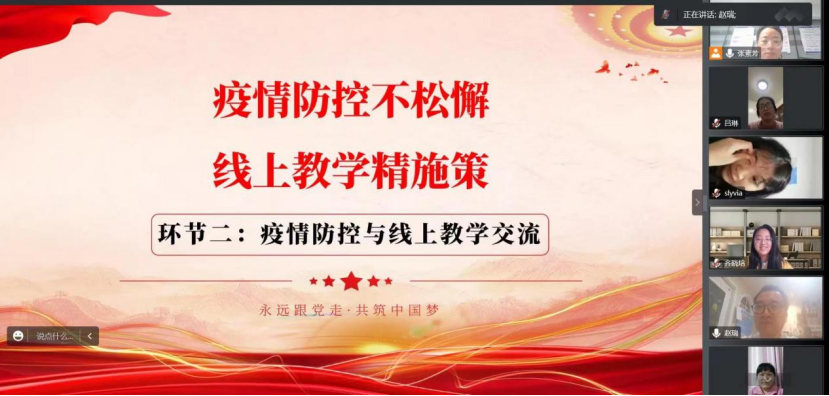 第二环节为:疫情防控与线上教学交流。全体老师围绕当下疫情防控以及线上教学进行了经验交流。吕琳老师表示结合学生在校封闭管理、线上上课的现状,首要是做好学生的心理疏导工作,其次是教学环节中增加师生互动、合作讨论等,提升学生线上上课的主动性和参与性。赵瑞老师建议通过师生连麦的方式,活跃线上课堂氛围,提高课程粘性,避免线上授课时出现“机在人不在、机听人不听”的问题。宋静静老师提出充分利用超星等直播平台的随堂练习、作业、问卷等答题功能,及时检测学生的线上学习效果,并根据学生反馈不断调整授课方法。张斐老师建议可根据00后学生无人不网、无处不网、无时不网的时代特点,鼓励学生分组自制课程小视频并进行展示,增加线上授课的趣味性,提升教学质量。