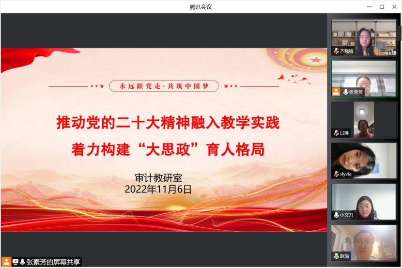 11月6日晚,财务会计学院审计教研室召开线上教学研讨会。会议主题为“推动党的二十大精神融入教学实践,着力构建‘大思政’育人格局”。会议由审计教研室主任张素芳主持,教研室全体教师参会。