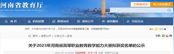 2023年河南省高等职业教育教学能力大赛分为学校比赛、省级网络评审、现场决赛等环节, 旨在深入贯彻党的二十大精神,落实立德树人根本任务,深化“三教改革”,“岗课赛证”综合育人,全面促进教师教学能力提升。