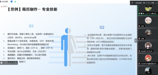 本次活动特邀正保网中网就业服务部就业总监、资深职业生涯规划专家高帅老师为同学们进行简历撰写与投递的精准培训。高老师首先从明确职业定位、突出求职意向,引导同学们思考自身职业规划,梳理个人简历制作思路;随后围绕优秀简历示例,从排版设计、证件照、教育背景、实践经历、专业技能等方面提出了详细的撰写建议;最后针对同学们关于简历投递的疑问进行了细致的解答。