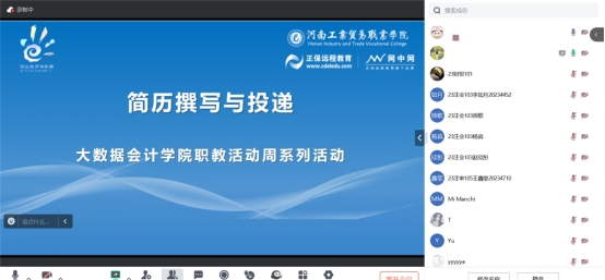 为落实《河南省教育厅办公室关于做好2025年河南省职业教育活动周相关工作的通知》和学校职教活动周相关要求,打通职业教育学生成长通道,提升学生就业竞争力。5月13日,我院以职业教育周活动为契机,联合正保大数据与会计产业学院开展了简历撰写与投递线上培训活动。