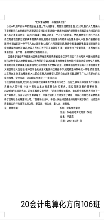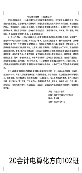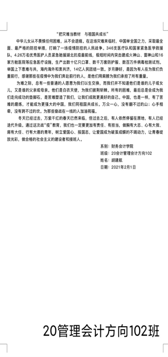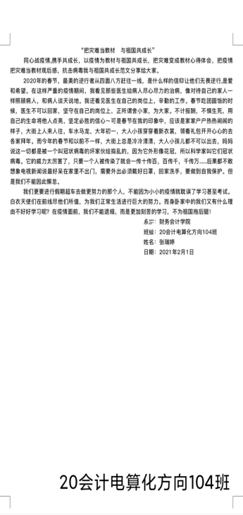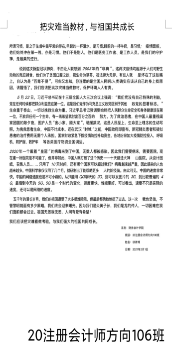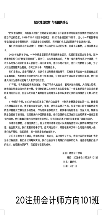 为大力加强爱国主义教育,努力把疫情危机化为教育契机,寒假期间,财务会计学院团总支带领20级所有团支部开展了以“把灾难当教材,与祖国共成长”为主题的线上投稿活动。