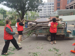 7月22日志愿小组开始了他们紧张作战,同学们首先清理道路上的杂物,但受连续强降雨和台风影响校园内的花草树木也遭到了不同程度的破坏,小路已经被断裂的树木挡住了去路,于是同学们齐心协力将树木抬走,随后同学们逐个排查了有安全隐患的地方,直到确认安全无误,同学们才稍稍放松了一些。