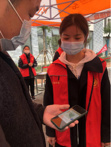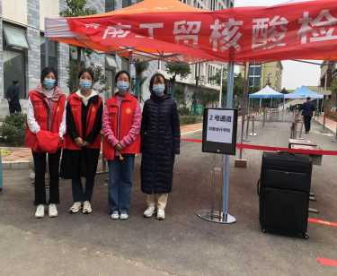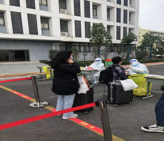 首先,志愿者核实学生的健康码和绿色行程码,核实完毕后,进入做核酸检测的环节。在寒风中,辅导员老师们给志愿者交流,等待学生的到来。