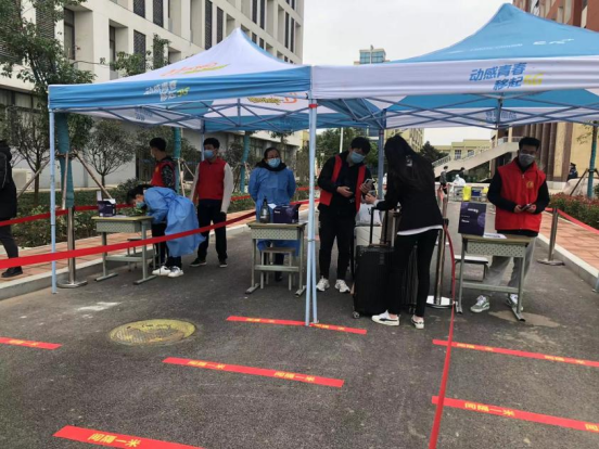一大早,学院大门敞开,各个部门严防部署,迎接学生的到来。根据防疫要求家长及外来人员严禁入内。学生按照提前部署的通道,在志愿者的帮助下完成入校手续。财务会计学院的志愿红在寒冷的秋季格外耀眼。