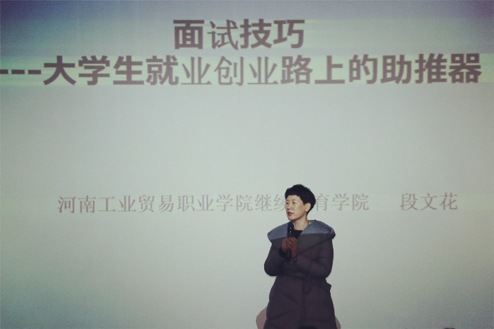 2018年1月9日下午,继续教育学院院长段文花以“面试技巧--大学生就业创业路上的助推器”为主题给财务会计系学生带来了“创新创业”系列第三场讲座。