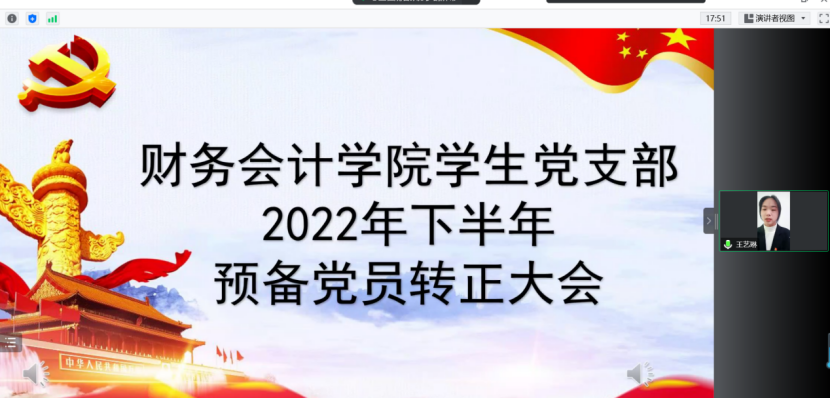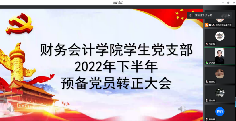 2022年11月23日下午,财务会计学院学生党支部在线上举行预备党员转正大会,对尹冰源、王艺琳同志转正事宜进行讨论。会议由学生党支部书记韩向霞主持,支部全体党员及19名积极分子代表参加。