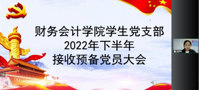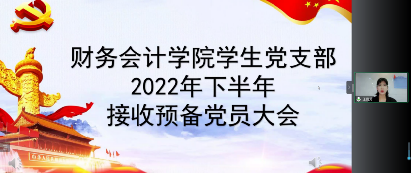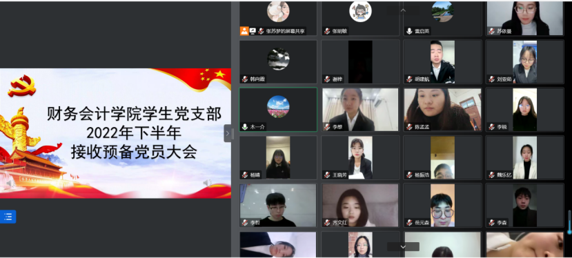 2022年11月23日下午,财务会计学院学生党支部在线上举行预备党员接收大会,对魏乐忆、齐文红等19名同志是否吸收为预备党员进行讨论。会议由学生党支部书记韩向霞主持,支部全体党员参加。