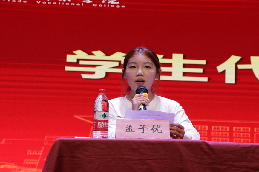 24注会102班孟子优代表新生发言,她提到大学生要立志高远、胸怀家国,在校期间要认真学习本领,培养职业能力,勇于尝试和创新,勇担时代责任。