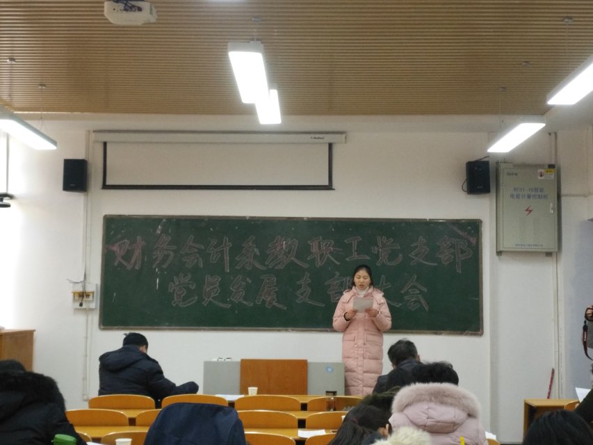 2018年12月11日下午,财务会计系教职工党支部在二号教学楼2204召开了全体党员大会,讨论审议接收范俊宏等51名同志为中共预备党员的事宜。会议由党支部书记谢桦主持,支部全体党员参加了会议。