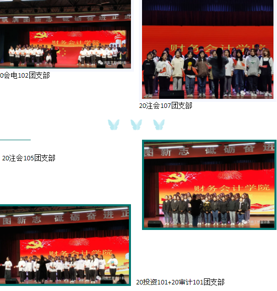 比赛最后以20注会101团支部获得一等奖,20注会107团支部、20会电102团支部获得二等奖,20会电105团支部、20会电107团支部、投资101和审计101团支部团队组合获得三等奖为本次预选赛画上了圆满的句号。 通过颂唱红色经典革命歌曲,展示了各团支部蓬勃向上,团结奋进的精神风貌;激发了奋发向上,积极进取的精神力量;也增强了青少年实现中华民族伟大复兴的使命感和责任感。