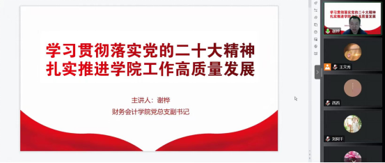 最后,谢桦结合本年度学院的疫情防控、教学管理、学生工作等方面与全体党员教师交流了学习体会,并号召全体党员教师充分发挥基层党组织的政治引领和战斗堡垒作用,发挥党员的先锋模范带头作用,践行立德树人根本任务,结合各自的本职工作,积极学习贯彻落实党的二十大精神。今后,财务会计学院党总支将在学校党委的坚强领导下,继续踔厉奋发、勇毅前行,持续深入推动各项工作务实开展、见力见效,为学校各项事业发展做出新的更大的贡献。