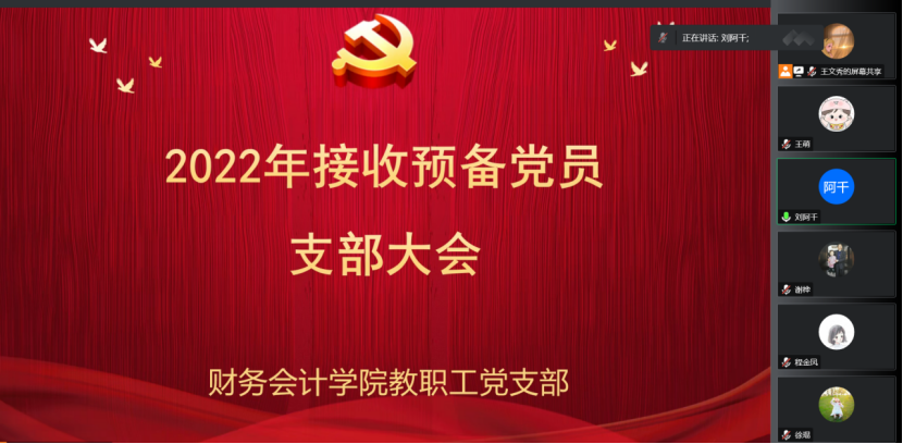 为进一步加强基层党组织建设,做好发展党员工作,11月23日下午5点,财务会计学院教职工党支部召开线上支部党员大会,讨论并确定关于接收程金凤同志为中共预备党员,会议由支委会组织委员刘阿千主持。