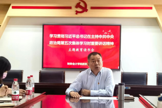 6月6日下午,财务会计学院教职工党支部在图书馆B8004会议室召开“学习贯彻习近平总书记在中共中央政治局第五次集体学习时的重要讲话精神”主题教育读书会,会议由支部书记谢桦主持,全体党员教师参加。机关第四党支部书记钱薇、音乐学院教职工党支部书记李晖、组织部组织科科长路标、基础理论教学部直属支部宣传委员孟芳一行到会进行巡听旁听指导。