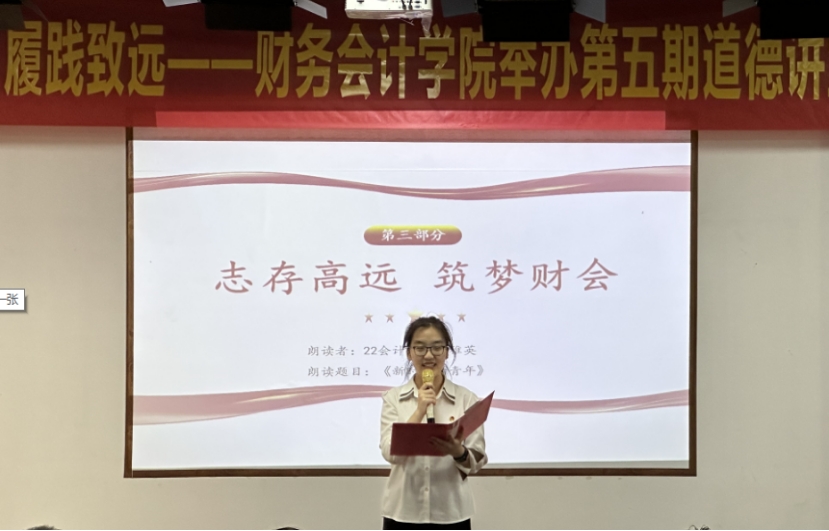 在“志存高远,筑梦财会”环节中,学生代表张稚英热情饱满地朗诵了《新时代的青年》,表达了财务会计学院莘莘学子立志做有理想、敢担当、能吃苦、肯奋斗的新时代好青年的决心和信心。
