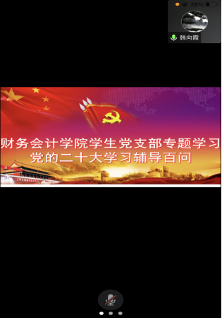 为深入学习贯彻党的二十大精神,2023年1月3日,财务会计学院学生党支部线上开展专题学习——党的二十大学习辅导百问。学生党支部书记韩向霞带领大家学习二十大精神的丰富内涵、精神实质和重大意义。