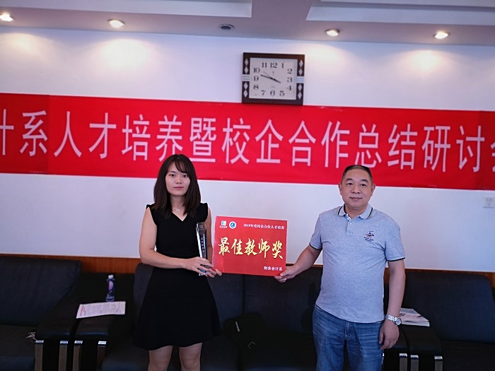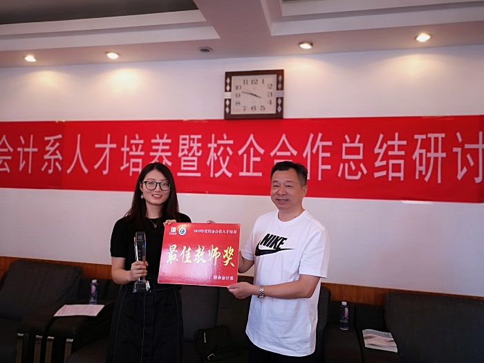 最后,谢桦主任和周建仁副书记为郭丽洁老师和葛晓萌老师颁发了优秀教师奖,鼓励大家再接再厉,为校企合作和财务会计系人才培养做出更大的贡献。
