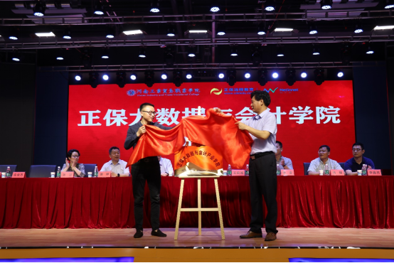 6月11日上午9点,我校与正保远程教育集团共建正保大数据与会计产业学院揭牌仪式在体育馆报告厅隆重举行。河南工业贸易职业学院校长王国福、正保远程教育集团高级副总裁王良诚共同为正保大数据产业学院揭牌,副校长李杰虎、财务会计学院院长谢桦、校企合作与国际交流处副处长张慧、厦门网中网软件有限公司总裁助理兼大区总经理季金、河南省区域负责人李鑫杰、产业学院项目总经理高福、部分教师及学生代表共同见证了揭牌仪式。