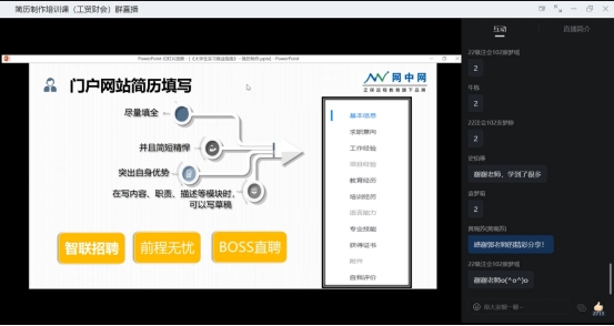 为全面贯彻党中央、国务院关于高校毕业生就业创业工作的决策部署,提升同学们的就业技能和职业规划意识,促进我院毕业生实现高质量就业,我院于5月30日中午12点30组织开展了简历制作线上培训会。培训会由正保远程教育集团的资深职业导致郭晓娟老师主讲,财务会计学院2024届毕业生、2025届即将进入实习的学生参加了此次培训会。