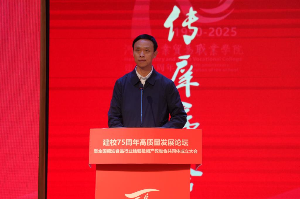 张国强代表河南省教育厅对学校建校75周年及全国粮油食品行业检验检测产教融合共同体成立致以诚挚祝贺。他表示,共同体是落实党中央部署、服务产业转型、守护粮食安全的关键举措,学校要始终坚持育人为本、强化协同创新、深化体制机制建设,以共同体为纽带推动食品产业高质量发展,为构建“教育链、人才链、产业链、创新链”深度融合的新生态注入强劲动力。
