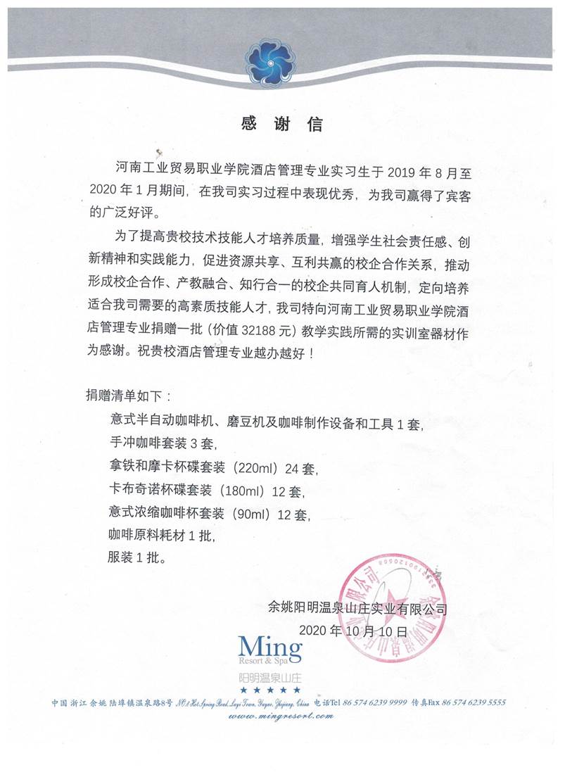2020年10月上旬,余姚阳明温泉山庄向我院工商管理系寄来了感谢信,充分肯定了我院酒店管理专业的教学水平,并捐赠了价值32188元的咖啡教学实训设备作为感谢。