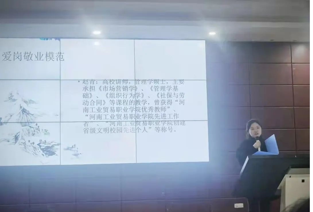 活动的下一个环节--我们身边的道德故事中,赵青老师、王媛媛老师分别讲述了她们的爱岗敬业的故事。赵青老师从教学、科研工作,学院行政坐班工作和辅导员工作方面讲了她的日常工作,她在学校加班是常事,用实际行动体现了爱岗敬业;