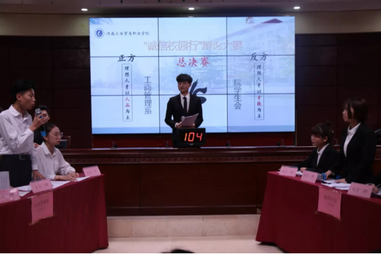 引笃学辩论之风,树工贸君子之道。5月31日下午,由院学生资助中心主办的“诚信校园行”大学生辩论赛在311报告厅圆满落下帷幕。经过初赛、复赛和决赛的激烈角逐,工商管理系代表队一路过关斩将,勇夺桂冠,贸易经济系代表队、院学生会代表队分别获得亚军、季军,工商管理系李秋远、贸易经济系徐剑及院学生会姚欣玉同学等喜获“最佳辩手”荣誉称号。副院长刘卫红、继续教育学院院长段文花,学生处副处长李松奇等同志亲临比赛现场,为获奖团队及选手颁发奖状和荣誉证书,并与获奖选手合影留念。