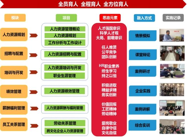 将理论知识与中华传统优秀文化紧密结合,培养学生“真善美”的道德品质;将理论知识与“岗课赛证”紧密结合,对接“1+X”人力资源共享服务证书、人力资源管理技能大赛考核要求、企业人力资源管理师和劳动关系协调员职业资格标准以及企业人力资源岗位需求,培养精益求精的职业人才;将理论知识与职业生涯规划紧密结合,培养学生正确的择业就业观及锲而不舍的奋斗精神;将知识传授与个人素养相结合,增强高职学生的“四个自信”;将思政建设纳入课程全过程考核,实现“三全育人”新局面。