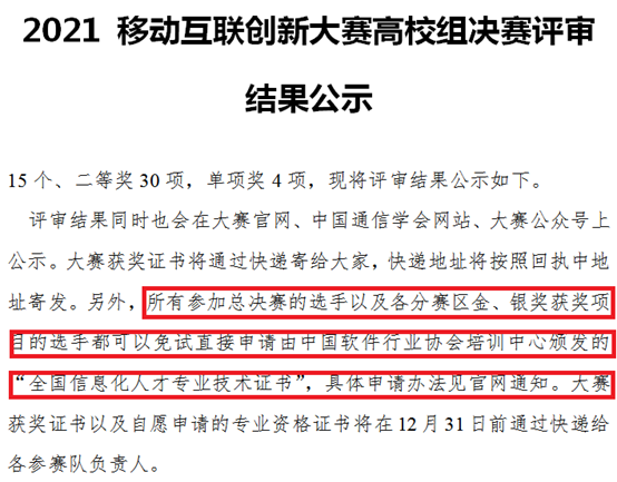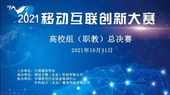 2021移动互联创新大赛是由工信部中国通信学会主办的国家级赛事,已连续成功举办六届,今年系我校首次参赛。大赛自六月份开赛以来,全国各分赛区经过初评、复评和公示,最终产生111个项目进入全国总决赛,其中本科赛道67项,职教赛道44项。