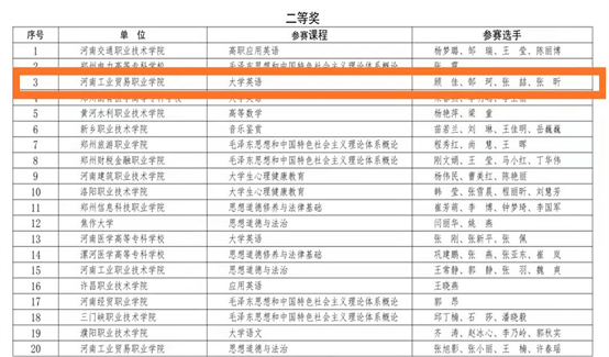 2021年12月14日-15日,由河南省教育厅主办、商丘职业技术学院承办的的2021年河南省高等职业教育青年教师课堂教学创新大赛在商丘职业技术学院成功举办,我院顾佳、郜珂、张喆、张昕四位教师组成的教学团队荣获公共基础课程组二等奖的好成绩。
