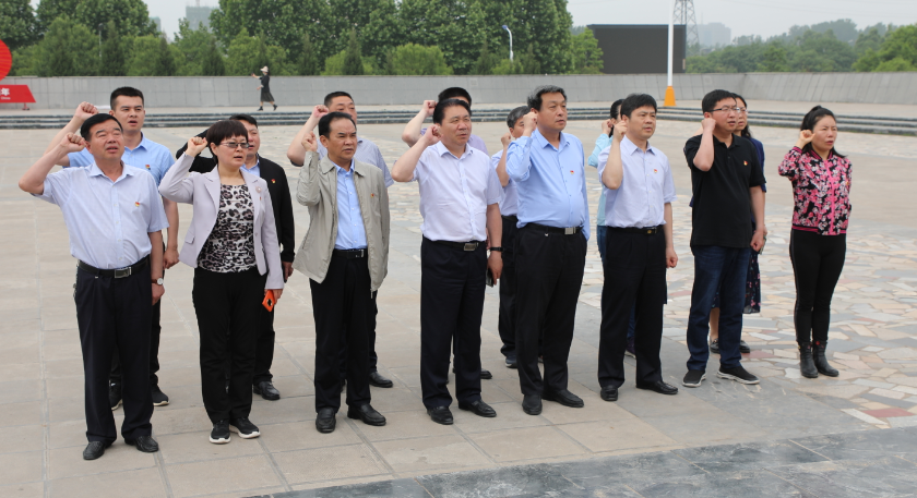 在吉鸿昌纪念馆广场上,调研组一行全体人员面对鲜红的党旗,高举右手,庄严宣誓,重温入党誓词,再次坚定了党员干部时刻不忘初心、永葆使命的信心和决心。